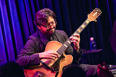 パスクァーレ・グラッソは、1940年代半ばから50年代前半にかけての、いわゆるビ・バップと呼ばれるジャズの一形態を心より愛する若手ギタリストだ。では、彼の演奏は“なぞり”なのか、“再現”なのか、というと断じて違う。ビ・バップの時代、ギターはどう考えてもメインの楽器ではなかった。ケニー・バレルやウェス・モンゴメリーが奮闘するのはもう少し後のことだ。そんな“ギター不毛”時代の音楽を、この2025年に、ギターをメインにしたセッティングで意気込みも新たに表現するのがグラッソなのだ。メロディ、コード、アドリブ、コンピング、カッティングを一手にこなすところはジョー・パスにも通じるところがあるけれど、なんというか、より精度が高い。単音ソロの滑らかさときたら、6弦の楽器を弾いているというより、とてつもなく長く音域の広い1本の弦のうえを指が舞っているかのようだ。無伴奏ソロ・アルバムが実に素晴らしいのだが、この日は全曲ベース、ドラムスとのトリオ。エルモ・ホープ作「ソー・ナイス」やチャーリー・パーカー作「ムース・ザ・ムーチ」など、なかなか今のライヴで聴けないナンバーを快調に届けた。(原田和典)